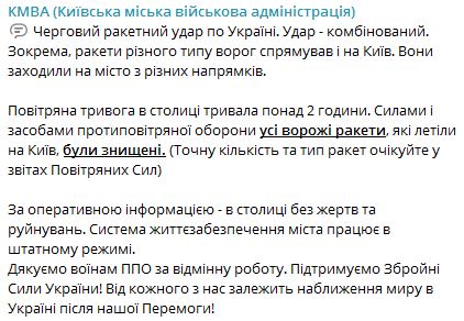 Воздушная тревога в Киеве длилась более двух часов. Силами и средствами ПВО все вражеские ракеты, летевшие на Киев, были уничтожены.