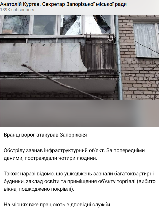 Утром 15 февраля в Запорожье под обстрел попал инфраструктурный объект. По предварительным данным, пострадали четыре человека.