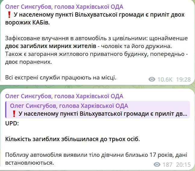 По словам Синегубова, в населенном пункте Ольховатской сельской общины зафиксировано попадание в автомобиль с гражданскими - погибли два человека, муж и жена. Рядом с машиной также нашли тело девушки около 17 лет.