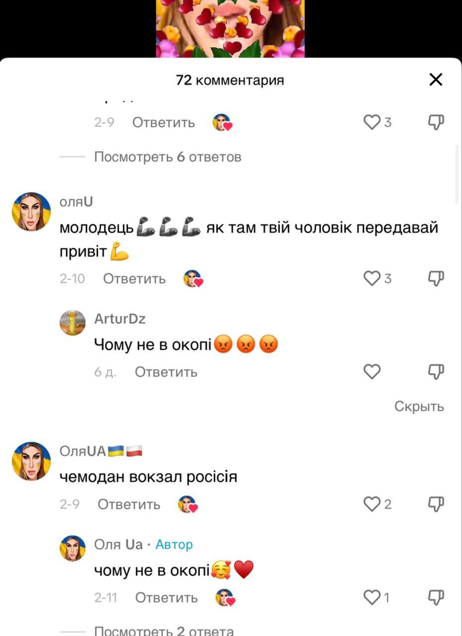 Авторы таких видео шутят, что муж "ОлиUA" скрывается от мобилизации, в то время как она зовет других в окоп.