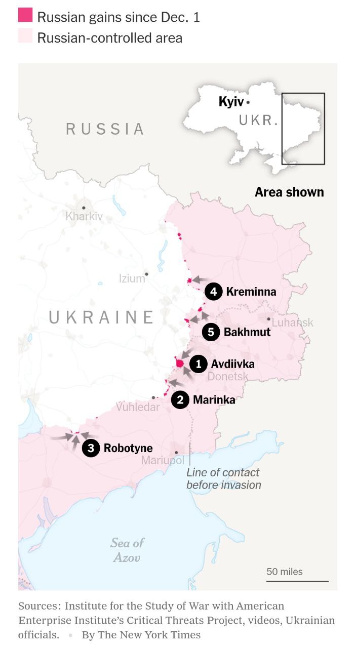 "Солдаты, сражающиеся в районе Угледара, заявили, что падение Авдеевки, расположенной в 55 милях к северо-востоку, скорее всего, высвободит российские войска для активизации атак с севера", - говорится в статье.