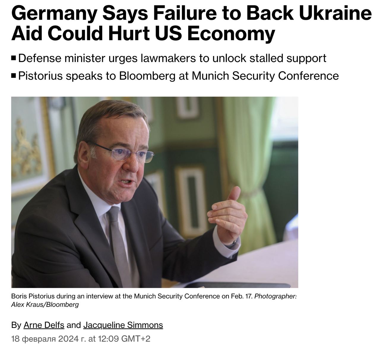 Писториус предупредил о последствиях поражения Украины не только для Европы, но и для США, заявив, что вторжение Путина представляет собой угрозу "основанному на правилах международному порядку".