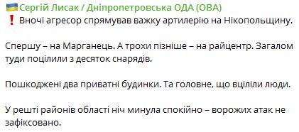 07.35 Ночью россияне выпустили с десяток снарядов по Никополю и Марганцу Днепропетровской области. Повреждены два частных дом. Обошлось без пострадавших.