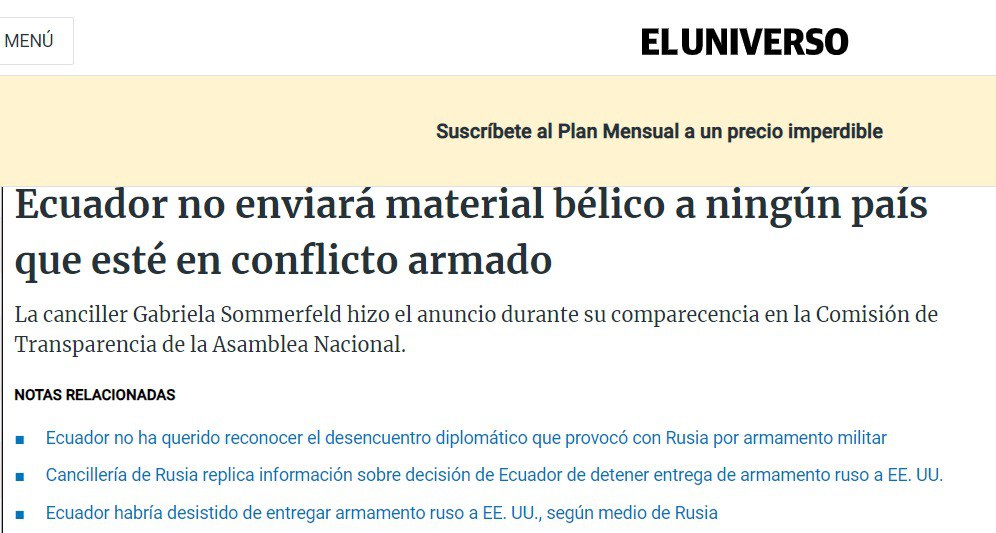 По ее словам, есть четкое указание президента Эквадора не снабжать военной техникой страны в состоянии вооруженного конфликта.