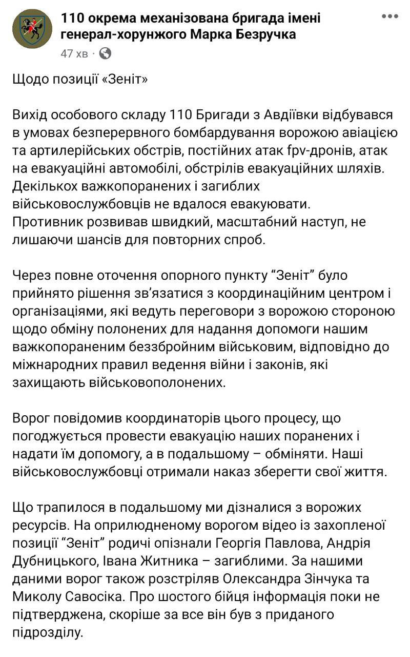 Бригада заявляет, что родственники опознали погибших военных на одном из опубликованных россиянами видео из Авдеевки. Речь идет о Георгии Павлове, Андрее Дубницком, Иване Житнике. Также, по данным бригады, расстреляны Александр Зинчук и Николай Савосик.
