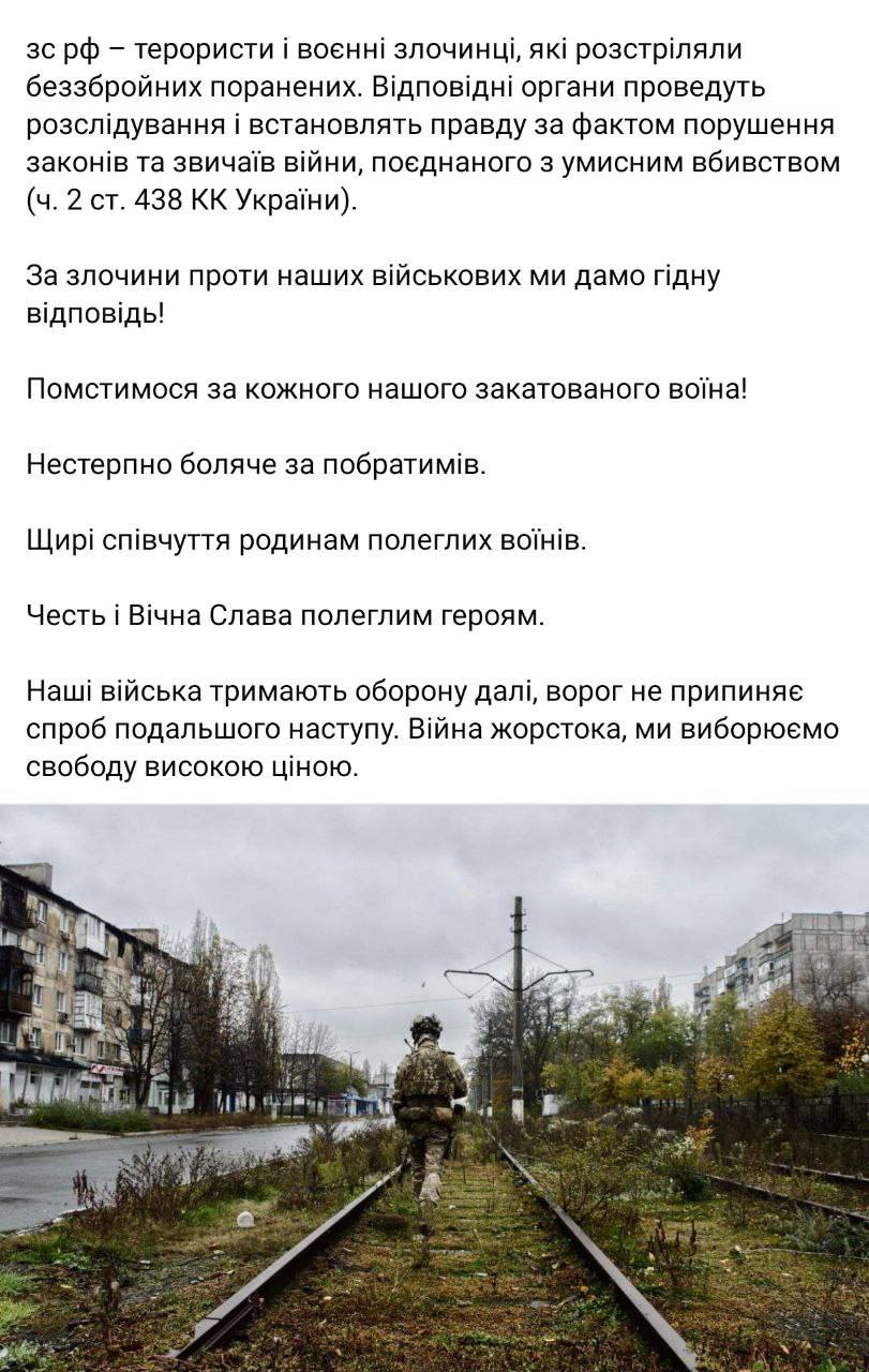 21:08 110-я бригада ВСУ заявила, что ее раненых бойцов, которых по приказу командования оставили в укрепрайоне "Зенит" после отхода оттуда украинских сил, расстреляли россияне.