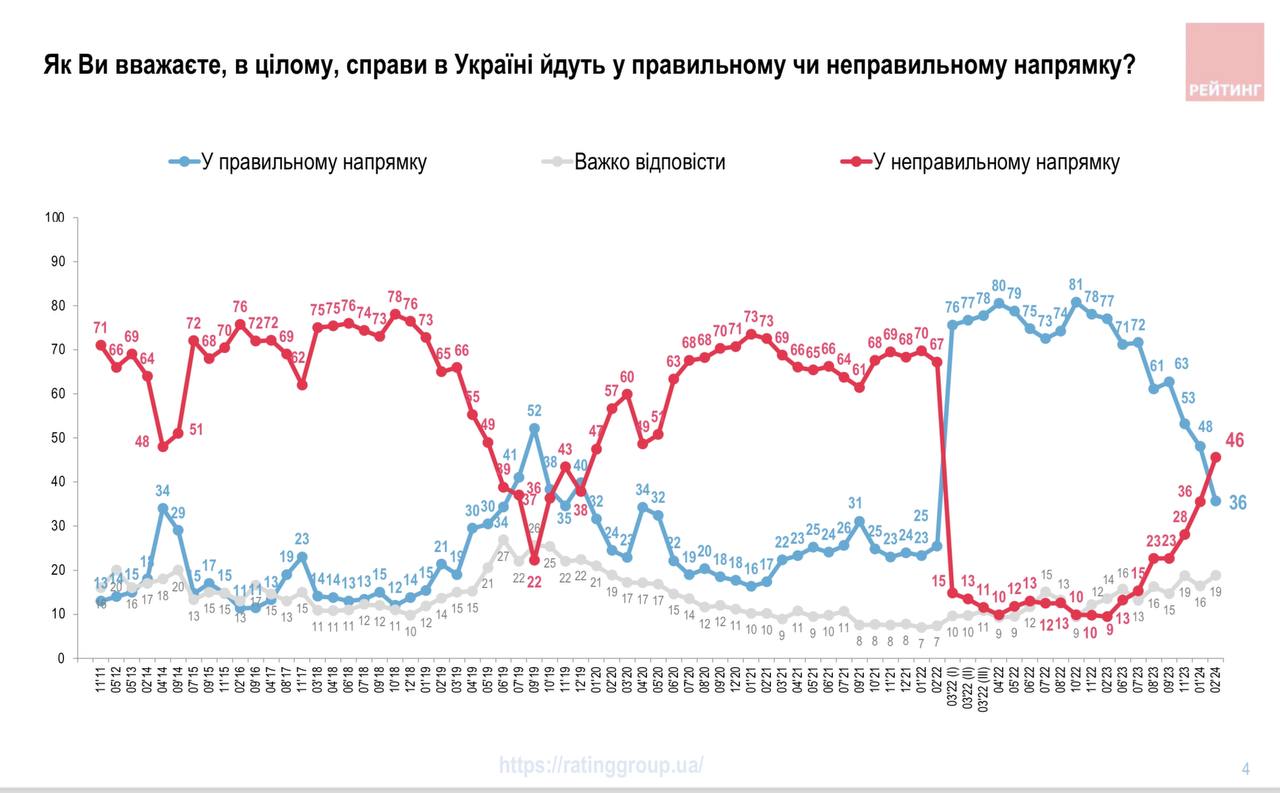 18:43 Число тех, кто считает, что Украина движется в неправильном направлении, впервые с начала войны превысило число тех, кто одобряет политику власти, причем сразу на 10%.