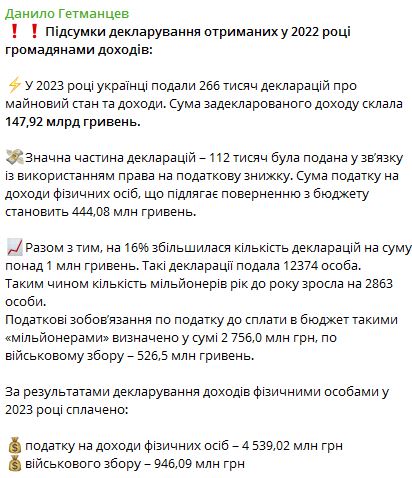 Также  написал, что в 2023 году украинцы подали 266 тысяч деклараций об имущественном положении и доходах. Сумма задекларированного дохода составила 147,92 млрд. гривен. Значительная часть деклараций – 112 тысяч была подана в связи с использованием права на налоговую скидку. Сумма налога на доходы физических лиц, подлежащего возврату из бюджета, составляет 444,08 млн гривен.