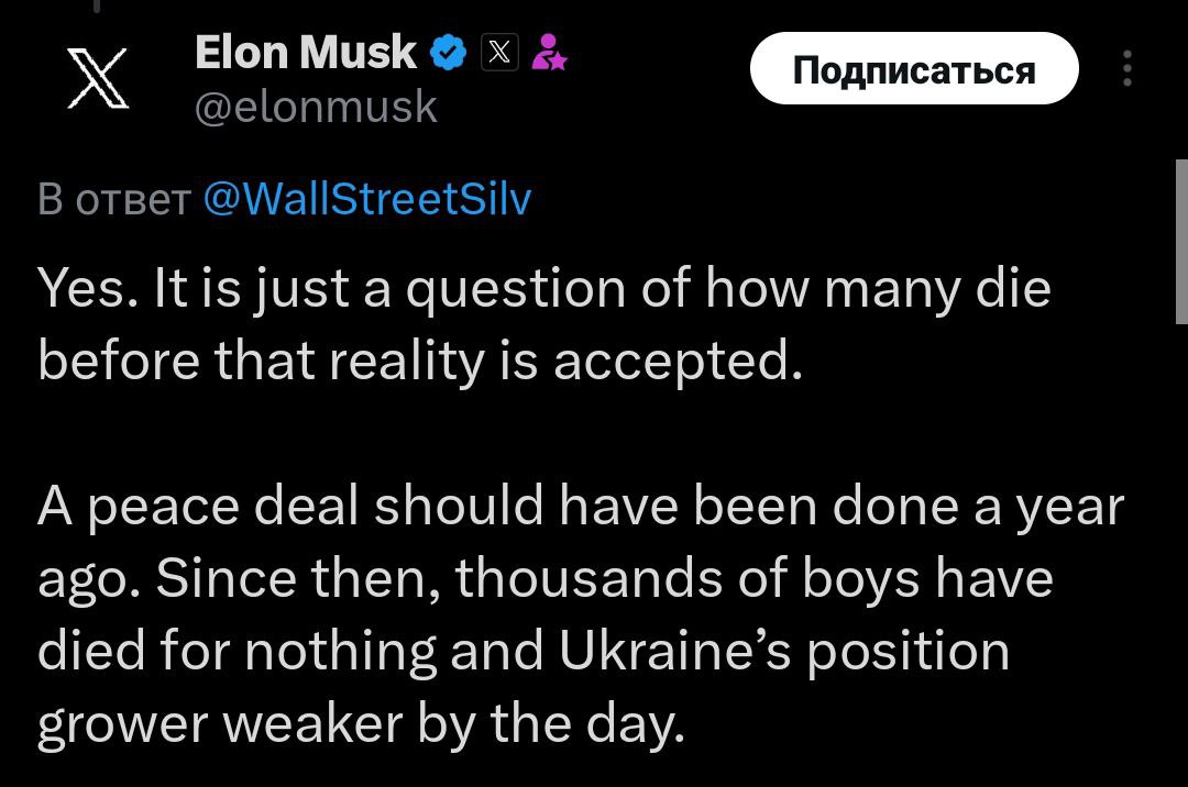 "Вопрос лишь в том, сколько людей умрет, прежде чем эта реальность будет принята. Мирное соглашение должно было быть заключено год назад. С тех пор тысячи мальчиков погибли ни за что, а позиции Украины становятся слабее с каждым днем", - отреагировал на это Маск.