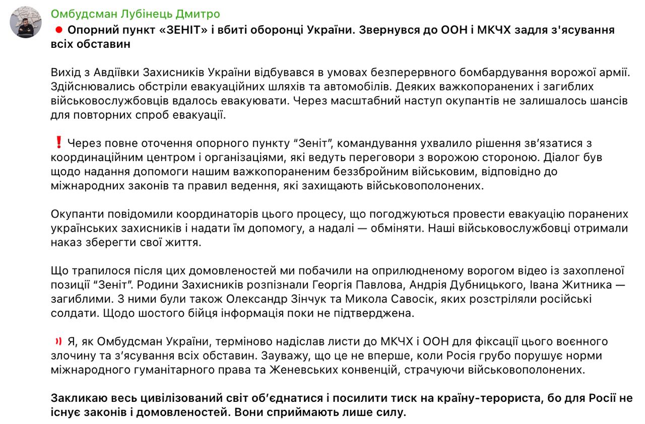 11.25 Омбудсмен Лубинец обратился в ООН и Красный Крест по поводу раненных украинских военных, взятых в плен на опорном пункте "Зенит", что южнее Авдеевки, которых, как вчера заявила 110-я бригада ВСУ, затем расстреляли россияне.