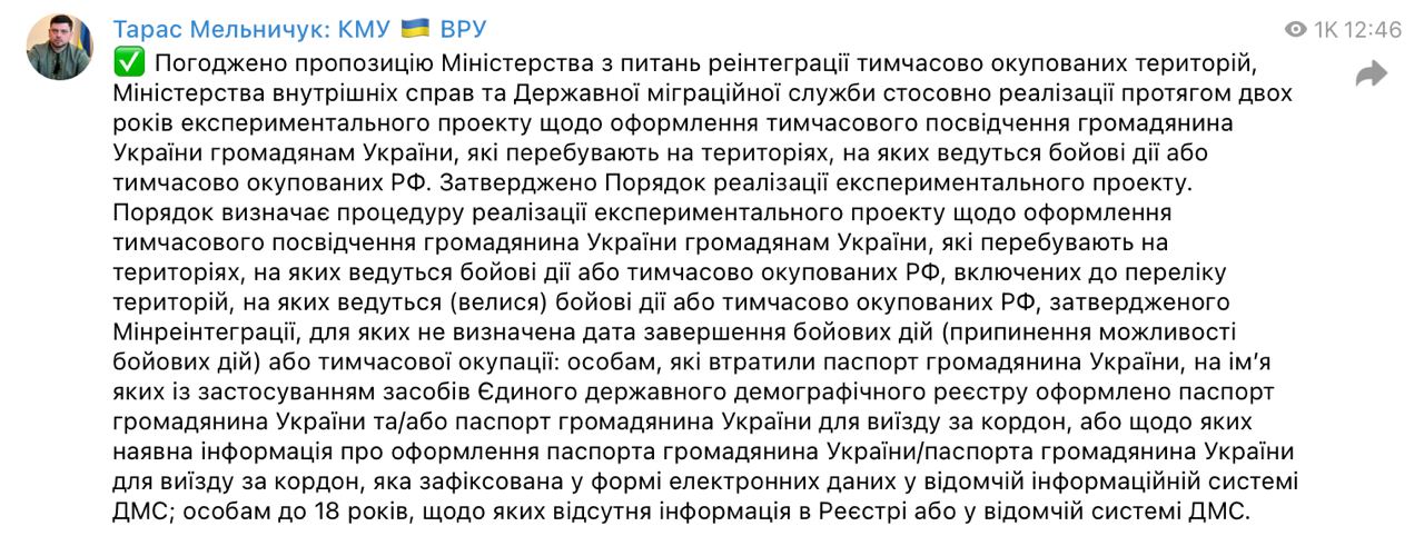 Предложение о выдаче временного документа внесли Министерство по вопросам реинтеграции временно оккупированных территорий, Министерство внутренних дел и Государственная миграционная служба. Пока это экспериментальный проект, который будет действовать два года.