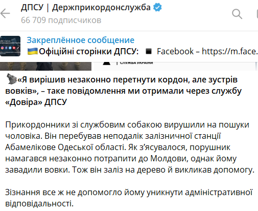 Как выяснилось, нарушитель пытался незаконно попасть в Молдову, однако ему помешали волки. Он залез на дерево и вызвал помощь. Признание все же не помогло ему избежать административной ответственности.