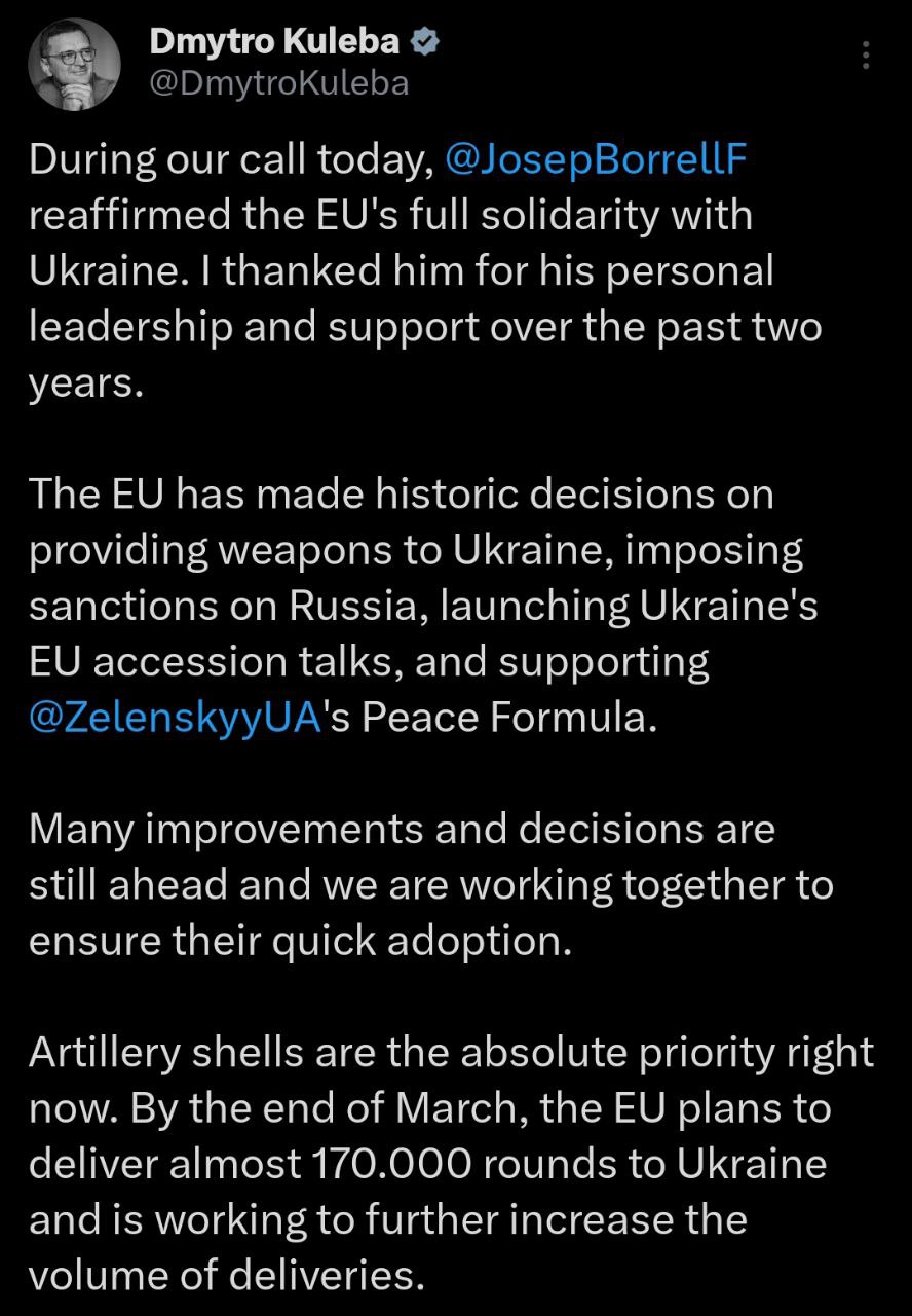 Об этом заявил министр иностранных дел Дмитрий Кулеба по итогам разговора с Верховным представителем ЕС Жозепом Боррелем.
