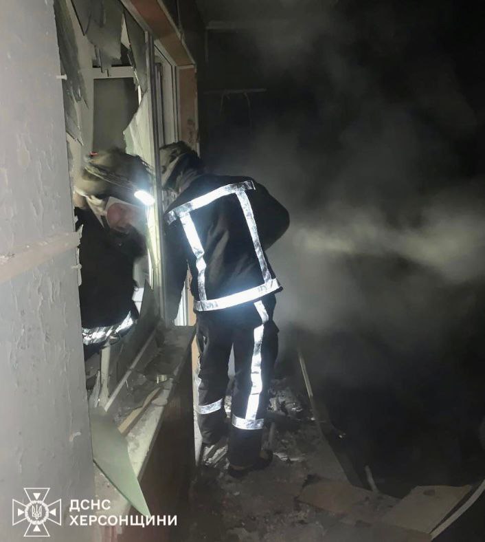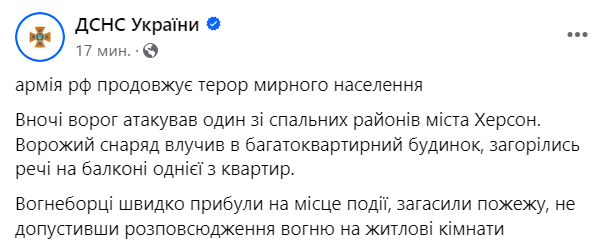 "Ночью враг атаковал один из спальных районов Херсона. Вражеский снаряд попал в многоквартирный дом, загорелись вещи на балконе одной из квартир", - говорится в сообщении.