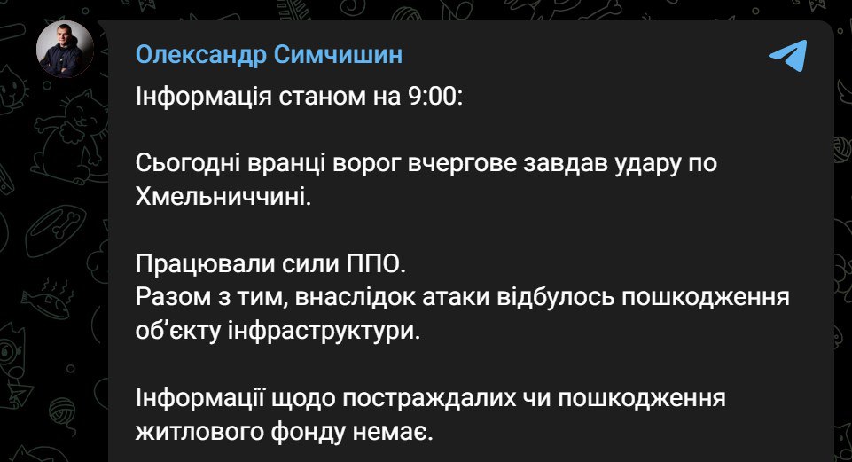 09:35 Во время ночной атаки дронов под удар попал объект инфраструктуры в Хмельницком.