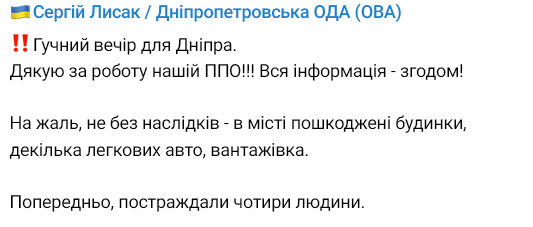 Об этом сообщил глава Днепропетровской областной военной администрации Сергей Лысак в своем телеграм-канале.