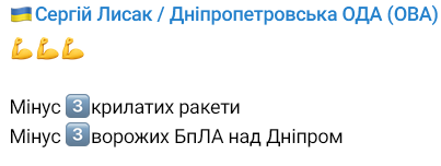 Лысак добавил, что силы ПВО сбили над Днепром три вражеских ракеты и три беспилотника.