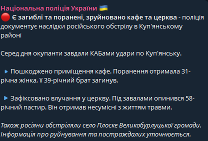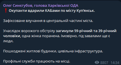Армия РФ ударила КАБами по центру Купянска, погибли двое мужчин, одна женщина ранена.