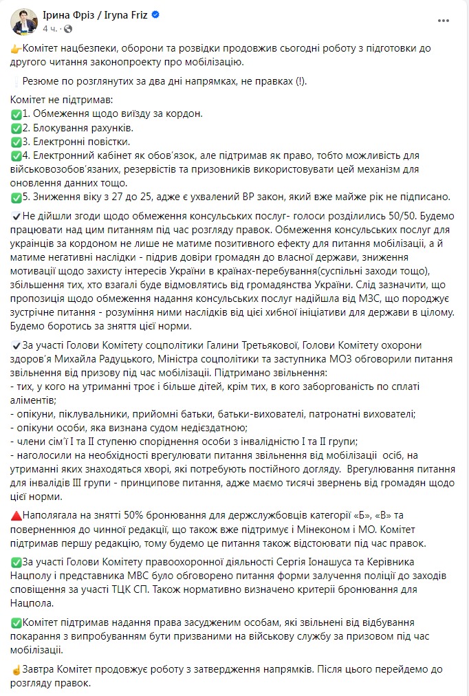 Об этом сообщила в Фейсбуке народная депутат Ирина Фриз.