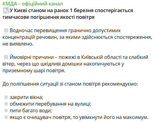 КГГА информирует, что вероятной причиной ухудшения качества воздуха были пожары в Киевской области и слабый ветер. Поэтому вредные примеси накапливаются в приземном слое воздуха.