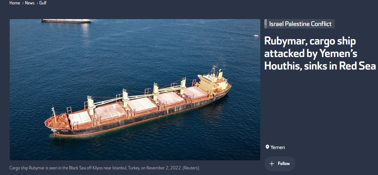 Сухогруз Rubymar, две недели назад атакованный йеменскими хуситами, затонул в Красном море.