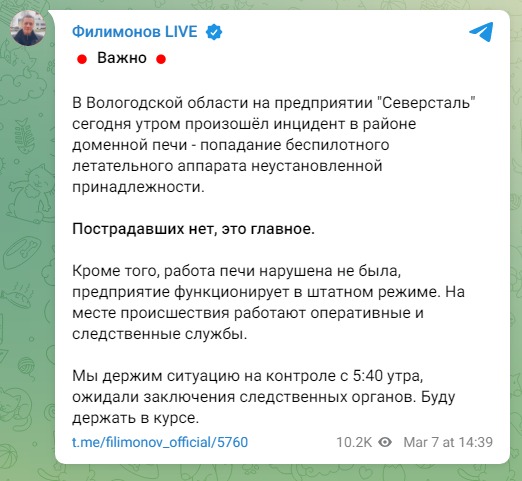 "В Вологодской области на предприятии "Северсталь" сегодня утром произошёл инцидент в районе доменной печи - попадание беспилотного летательного аппарата неустановленной принадлежности. Пострадавших нет, это главное. Кроме того, работа печи нарушена не была, предприятие функционирует в штатном режиме. На месте происшествия работают оперативные и следственные службы", - сказано в его посте.