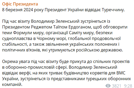 "Владимир Зеленский посетит верфи, на которых идет строительство корветов для ВМС Украины, встретится с представителями турецких оборонных компаний", - говорится в сообщении Офиса президента.
