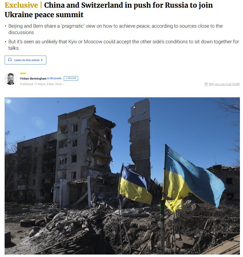 Китай и Швейцария настаивают на том, чтобы Россию пригласили на саммит прекращению войны в Украине. Две страны разделяют "прагматичный взгляд на то, как достичь мира", и что формат без России рискует стать дипломатическим эквивалентом "потёмкинской деревни".