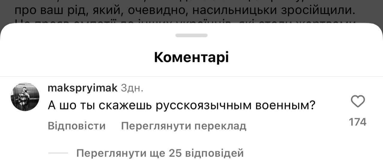 "Мне, например, все равно на каком языке Христя пойдет нах@й. Українською или на русском. Когда в это же время мой русскоязычный отец в окопах и защищает и Христю в том же числе".
