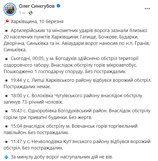 Об этом сообщает глава Харьковской ОВА Олег Синегубов.