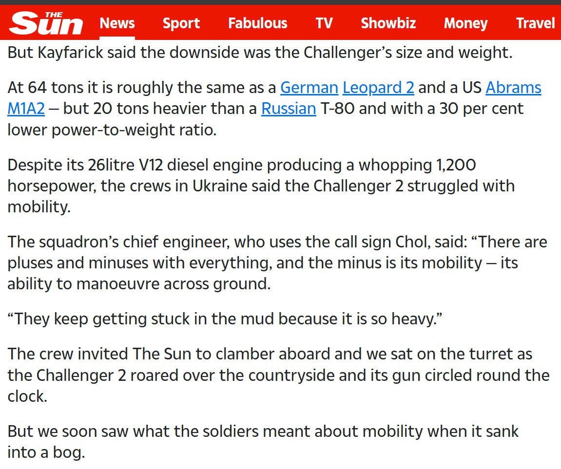 Но "недостатком является размер и вес Challenger", сообщил газете украинский военный с позывным "Кейфарик".