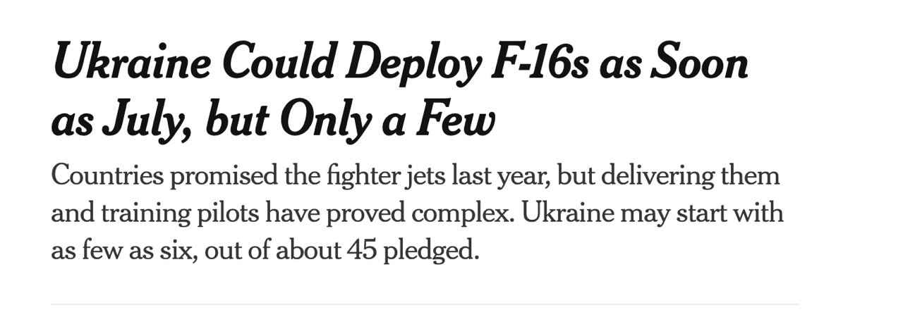 Но это не значит, что украинских пилотов не готовят. Ожидается, что на данный момент двенадцать пилотов - меньше, чем полная эскадрилья - будут готовы летать на F-16 в бою к лету этого года после 10 месяцев обучения в Дании, Великобритании и США.