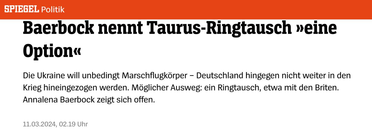 16.50 Представитель правительства ФРГ Штеффен Хебештрайт заявил, что позиция Берлина в вопросе поставок Taurus не изменилась. То есть Берлин против этого.