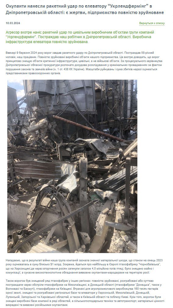 12.24 Армия РФ вечером 9 марта нанесла ракетный удар по элеватору в Днепропетровской области, полностью разрушив предприятие.