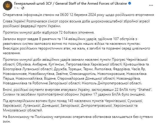 Что происходит на фронте 12 марта. Утренняя сводка Генштаба ВСУ