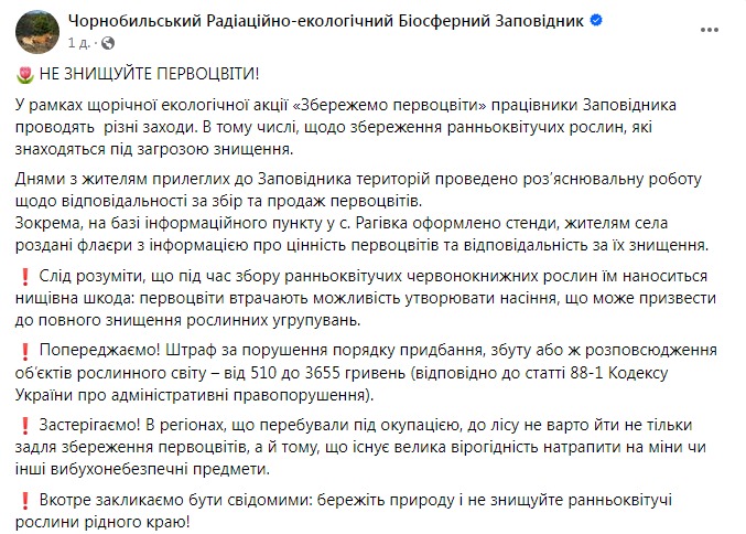 Чернобыльский радиационно-экологический биосферный заповедник призвал украинцев не уничтожать первоцветы.
