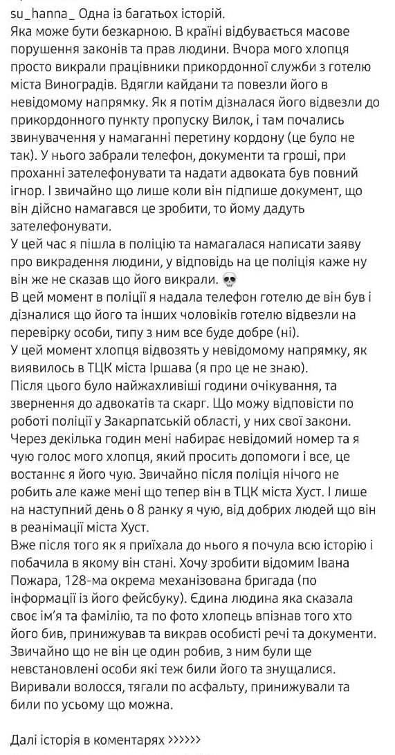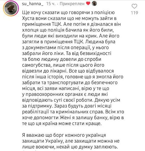 После чего парня доставили в ТЦК города Хуст, где его избивали до тех пор, пока он не решил покончить жизнь самоубийством, только после этого парня отвезли в реанимацию, пишет девушка.