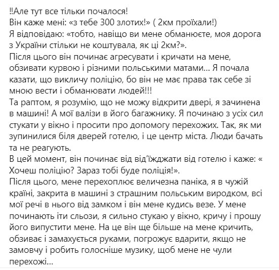Как сообщила Кристина Петрочук, она приехала из Украины на центральный вокзал в Варшаве и договорилась с таксистом на паркинге о поездке. Он привез ее в гостиницу, но вместо ранее озвученных 20 злотых (около 200 гривен) сказал платить 300.