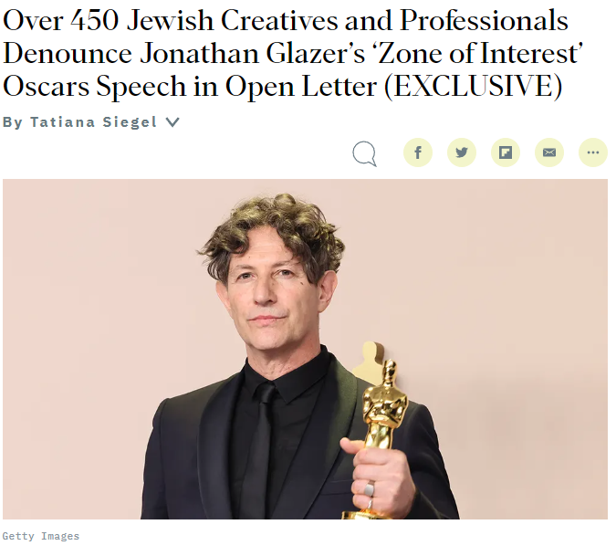 Во время вручения премии "Оскар" Глейзер получил награду за лучший иностранный фильм и выступил против дегуманизации палестинцев в Газе и оправдания их оккупации.