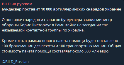 "Кроме того, в рамках нового пакета помощи будет поставлено 100 бронемашин для пехоты и 100 транспортных машин" - сообщает Bild.