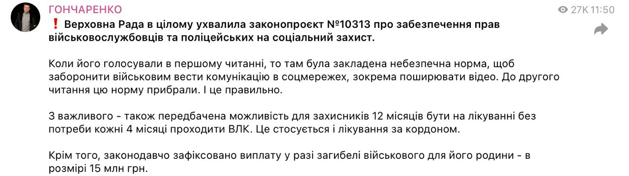 13.10 Верховная Рада убрала из законопроекта №10313 об обеспечении прав военнослужащих и полицейских на социальную защиту норму про запрет военным снимать видео с передовой и выкладывать в соцсети, сообщает нардеп Гончаренко.