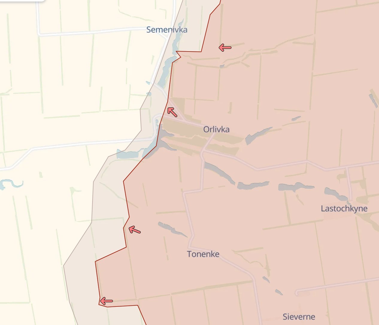Москва заявила о взятии Тоненького еще в четверг, а о захвате Орловки - во вторник. Однако Украина этого не подтверждала. Украинский военный паблик Deep State пишет, что как минимум западные окраины Орловки удерживаются ВСУ. В то же время на карте паблика видна окраина Орловки в серой зоне.