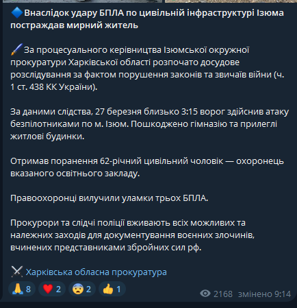После ночного удара "Шахеда" в Изюме частично разрушена гимназия, а также жилые дома.