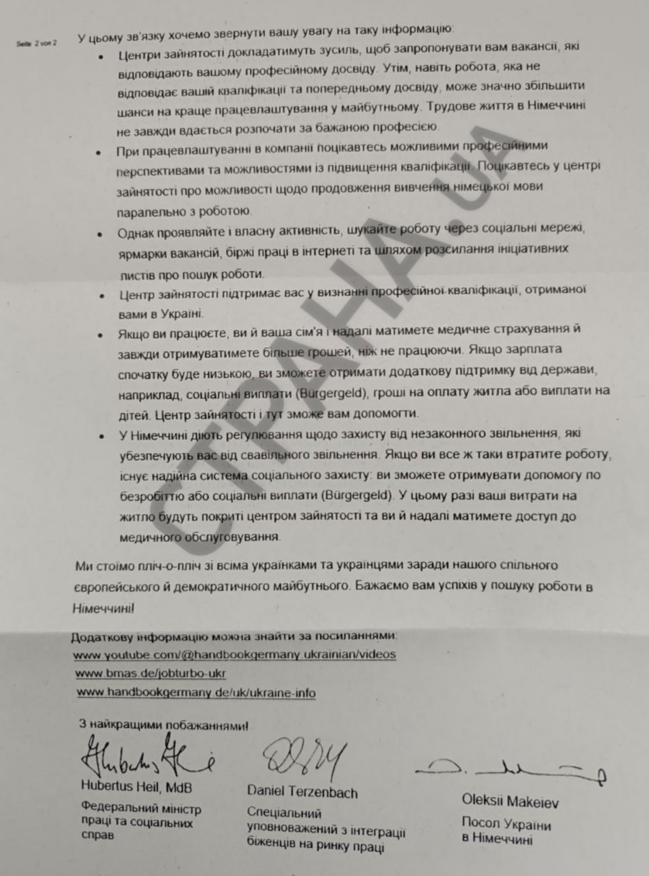 Такое письмо начало приходить домой к гражданам Украины, живущим в Германии. Помимо Макеева, его подписали немецкий министр труда Хубертус Хайль и уполномоченный по интеграции беженцев Даниэль Терценбах.