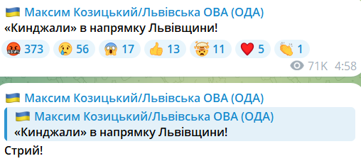 В свою очередь пуск ракеты по региону подтверждал и глава Львовской областной военной администрации Максим Козицкий.