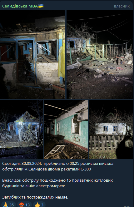 В ночь на субботу 30 марта российские военные обстреляли город Селидово Донецкой области двумя ракетами С-300.