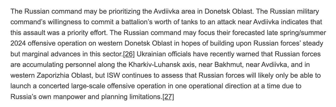 "Но ISW по-прежнему считает, что российские силы, скорее всего, смогут начать согласованную крупномасштабную наступательную операцию только на одном операционном направлении за один раз из-за ограничений России в плане людских ресурсов и планирования", - пишет Институт.