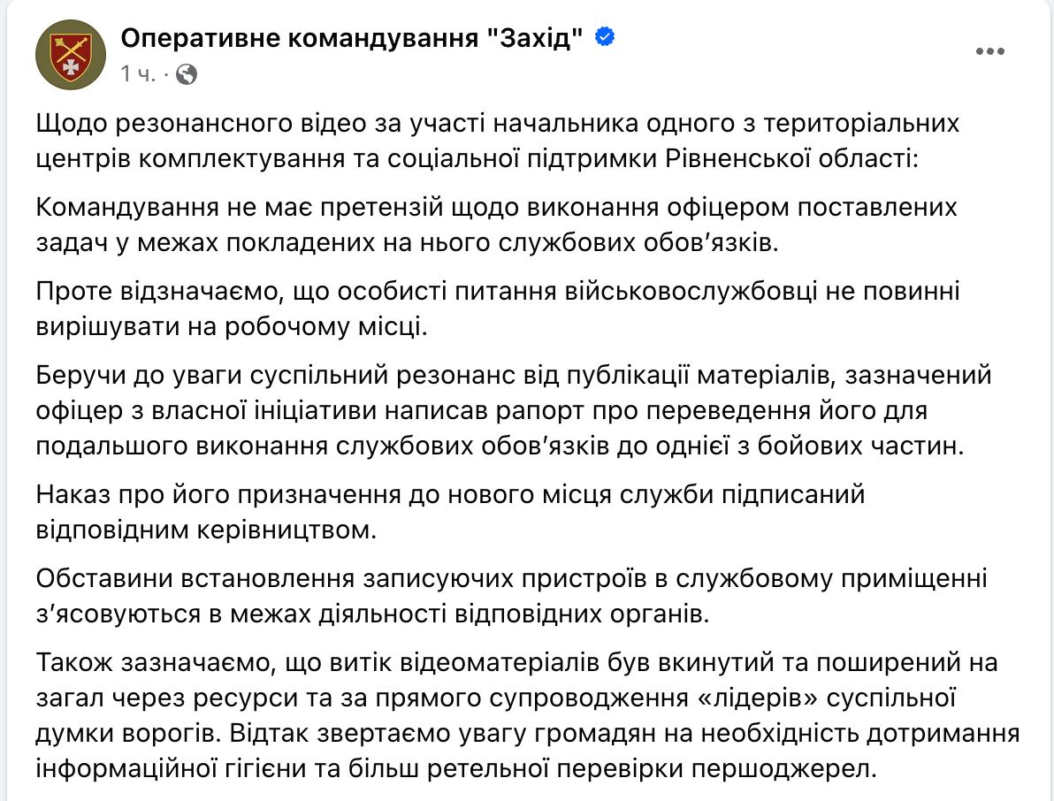 13.50 Ровенский военком, который целовался с сотрудницами на рабочем месте, написал рапорт о переводе в боевую часть, сообщает оперкомандование Запад.