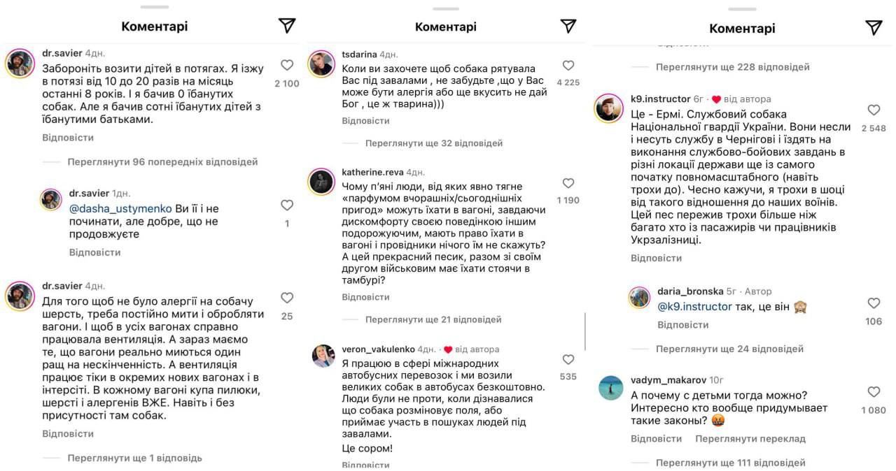 Как выяснилось позже, военный ехал со служебным псом Нацгвардии по имени Эрми. В своем посте "Укрзалізниця" и страница Нацгвардии сообщили, что до Киева собака и кинолог ехали в выкупленном купе. После чего до Чернигова кинолог с псом добирались на "Интерсити" в тамбуре, чтобы не мешать другим пассажирам.