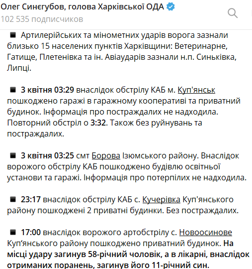 "3 апреля в 03:29 в результате обстрела КАБ г. Купянск повреждены гаражи в гаражном кооперативе и частный дом. Информация о пострадавших не поступала. Повторный обстрел в 3:32. Также без разрушений и пострадавших. В пгт Боровая Изюмского района в результате вражеских обстрелов КАБ повреждены здание образовательного учреждения и гаражи. Информация о пострадавших не поступала", - говорится в сообщении.